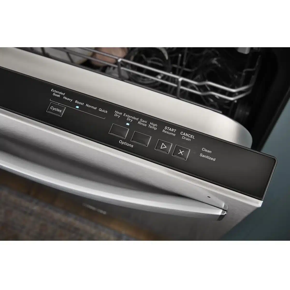 Clean dishes with a 55 dBA quiet dishwasher. Three 5″ Cup Shelves free up extra space and a Boost Cycle provides extra effort for cleaning up stubborn messes. This dishwasher includes an Extended Dry Option to elevate drying performance and a Triple Filtration Wash System that filters food particles and cleans the water between wash stages.