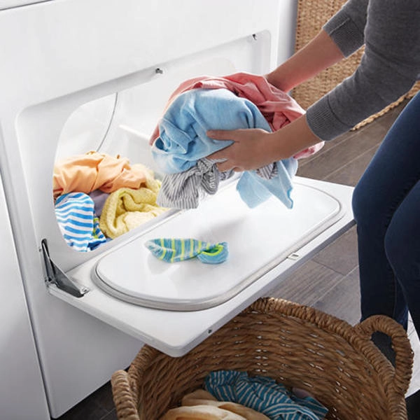 Easily transfer loads from the washer to the dryer and from the dryer to the laundry basket without worrying about clean clothes falling on the floor with this wide-opening door.