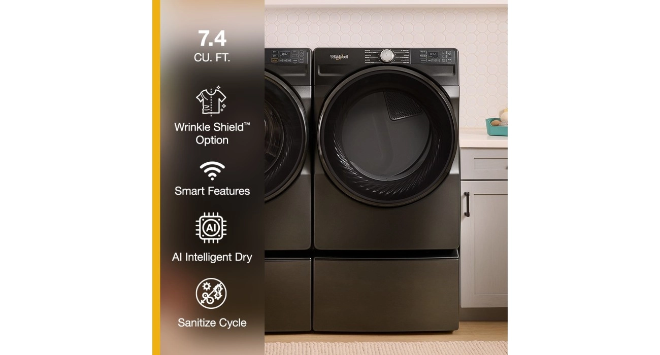 27 Inch Smart Gas Dryer with 7.4 cu ft Capacity, Wrinkle Shield™, AI Intelligent Dry, Quick Wash & Dry, Sanitize Cycle, Air Dry Cycle, Whirlpool® App, Cycle Notification, Voice Control, Family Share and ENERGY STAR® Certified
