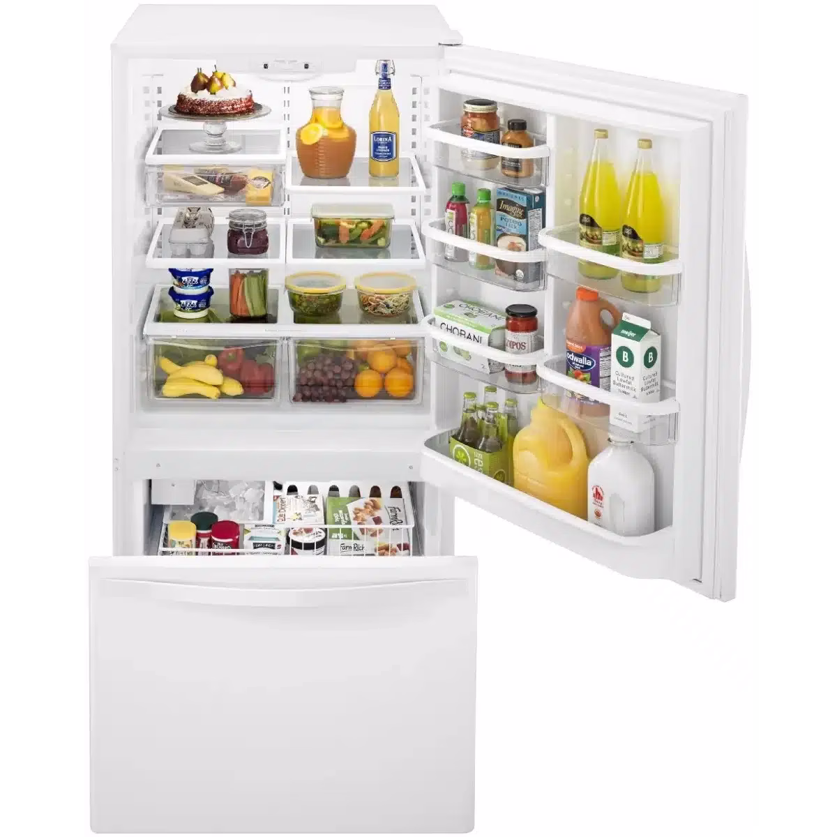 - 2 door bottom freezer refrigerator: 1 refrigerator compartment door and 1 freezer compartment drawer